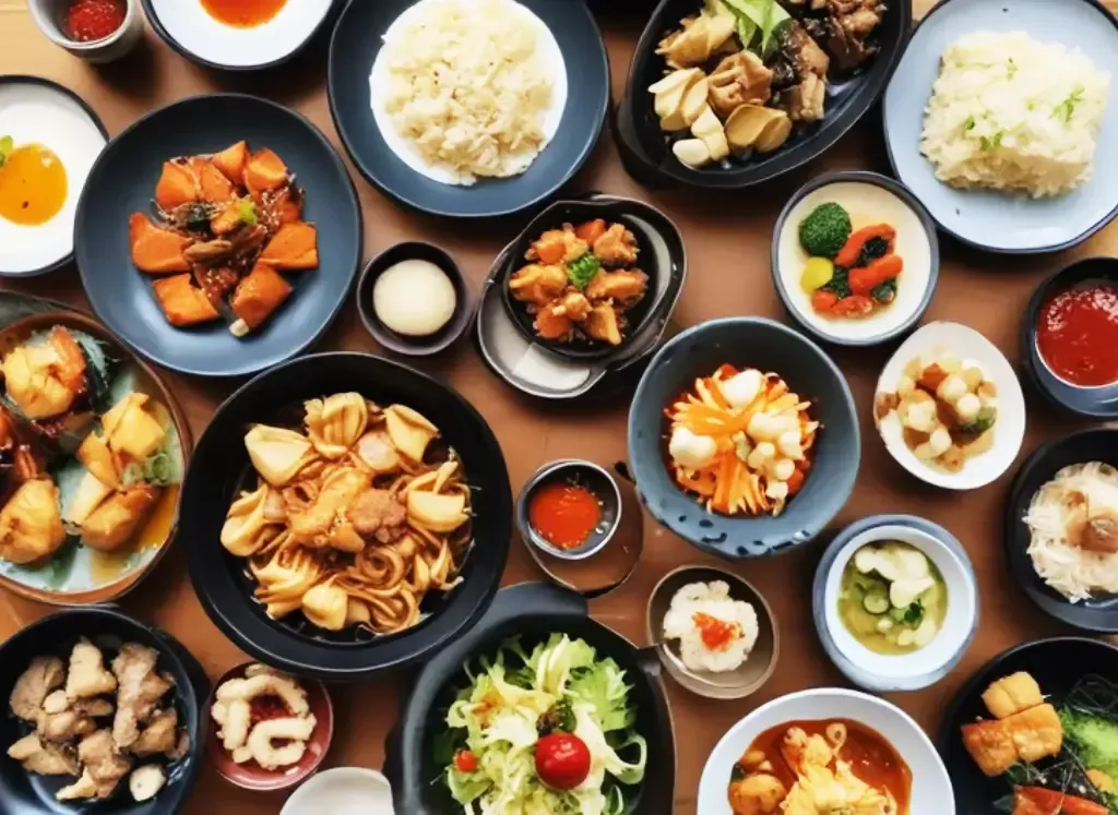 Salada de Pepino com Vinagre de Arroz (Agridoce); Cabelo de Anjo Perfumado com óleo de gergelim; Alface Americana com Manga, Tomates, Pepino Japonês e Parmesão; Molho de Alcaparras; Molho de Vinagrete.