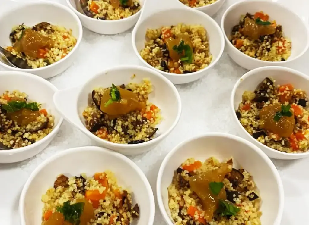 Cuscuz Marroquino de Legumes de Chutney de Manga; Mini Brusquetas de Aspargos Verdes; Mini Brusquetas de Tomate; Ceviche; Canapés de Salmão Defumado; Tartare de Salmão com Massa Filo.